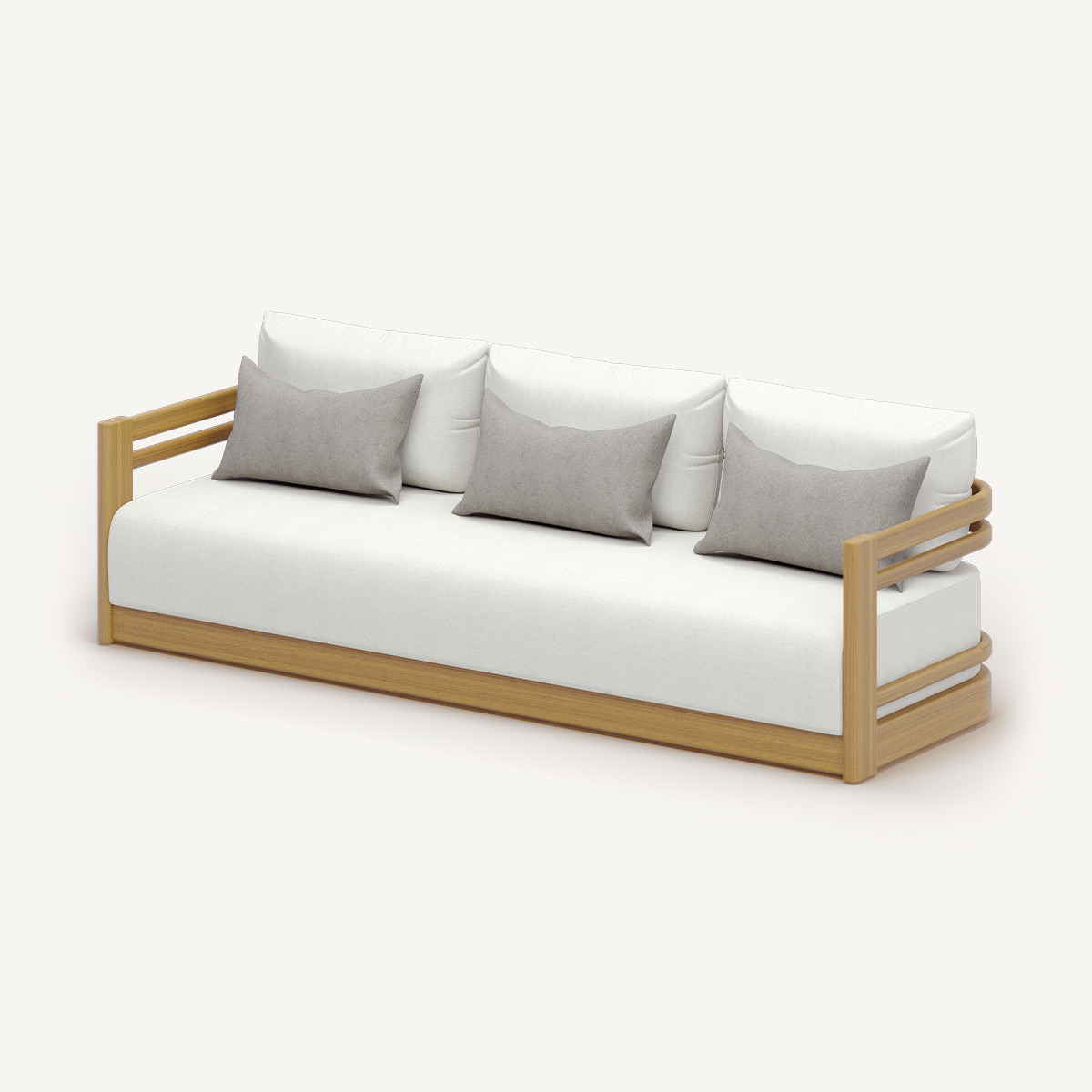 Съёмные чехлы коллекции HAMETT выполнены из высокотехнологичных тканей, разработанных специально для использования на открытом воздухе. Эти материалы не выцветают под воздействием солнца (стойкость к UV-излучению); обладают водо- и грязеотталкивающими свойствами пропиткой; имеют структурную плотность, сохраняющую форму подушек даже при интенсивной эксплуатации. Обратите внимание, что все наши материалы тактильно приятны и внешне приближены к интерьерному текстилю. Обивка доступна в нейтральной палитре, которая подчёркивает натуральную фактуру дерева и не конфликтует с ландшафтным окружением.