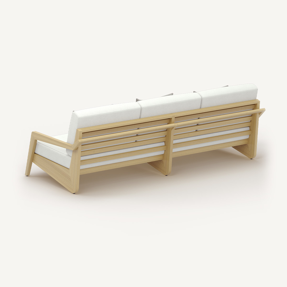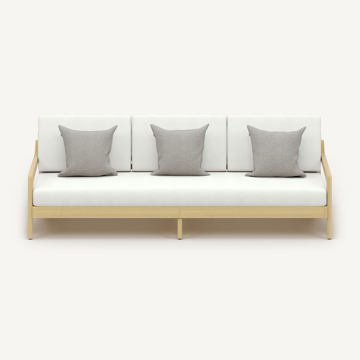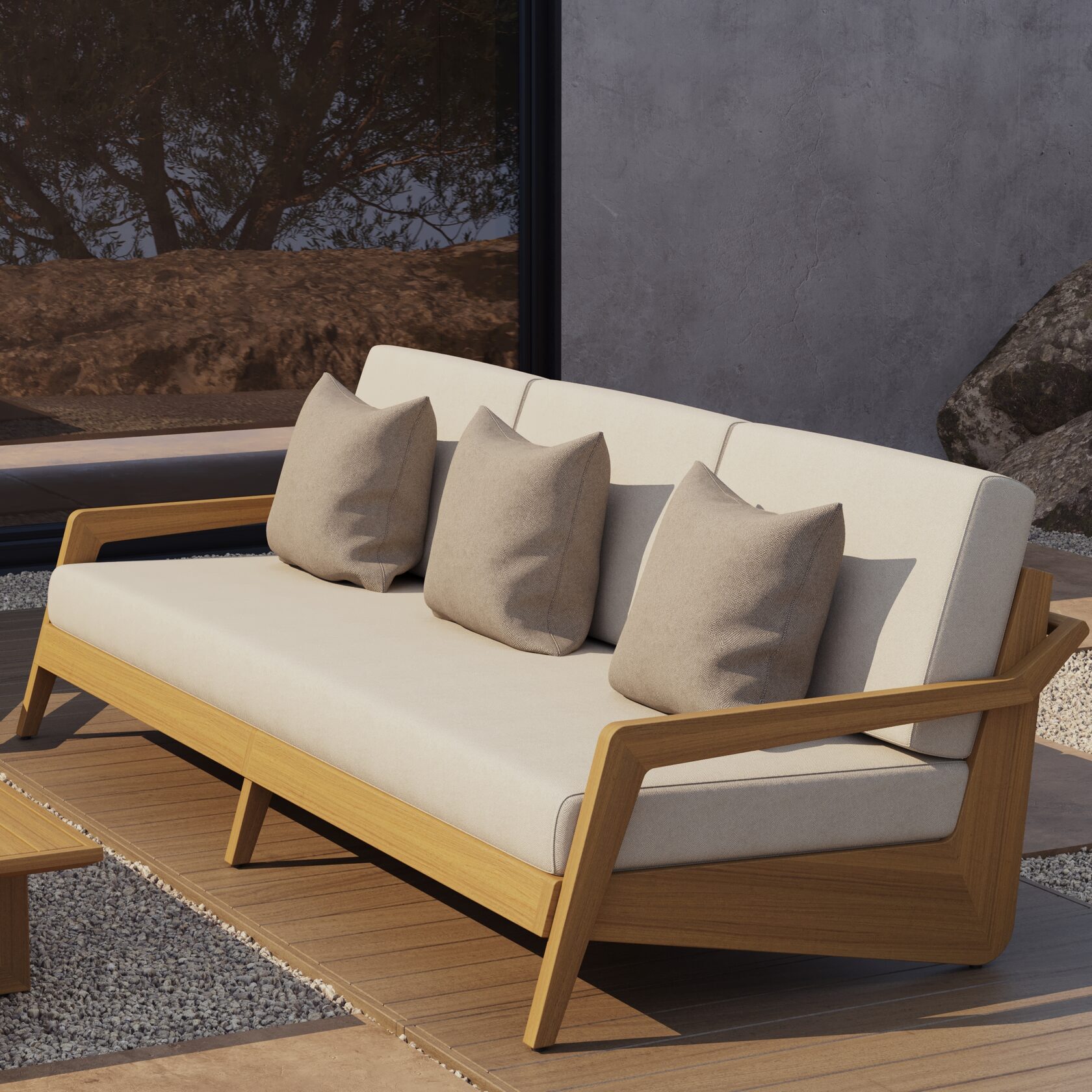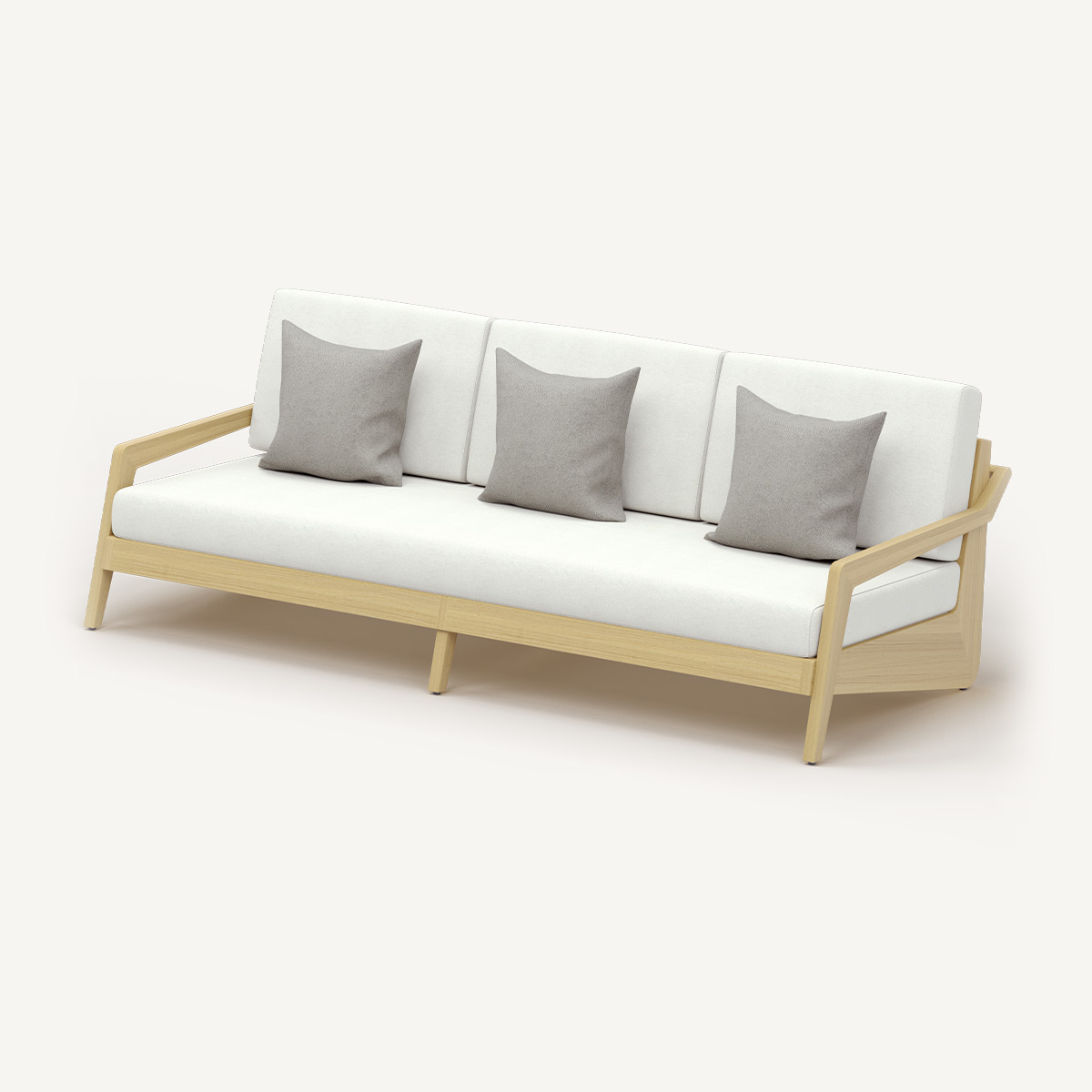 Обивочные материалы — это современные outdoor-ткани, разработанные специально для использования на открытом воздухе. Они обладают высокой светостойкостью (UV-resistance), защитой от влаги и загрязнений, а также сохраняют плотность и форму даже при активной эксплуатации. Съёмные чехлы доступны в палитре приглушённых природных оттенков, подчёркивающих натуральную эстетику дерева. Ткань имеет текстурированную поверхность, тактильно схожую с интерьерным текстилем, что делает посадку комфортной, а визуальный образ — уютным и живым.