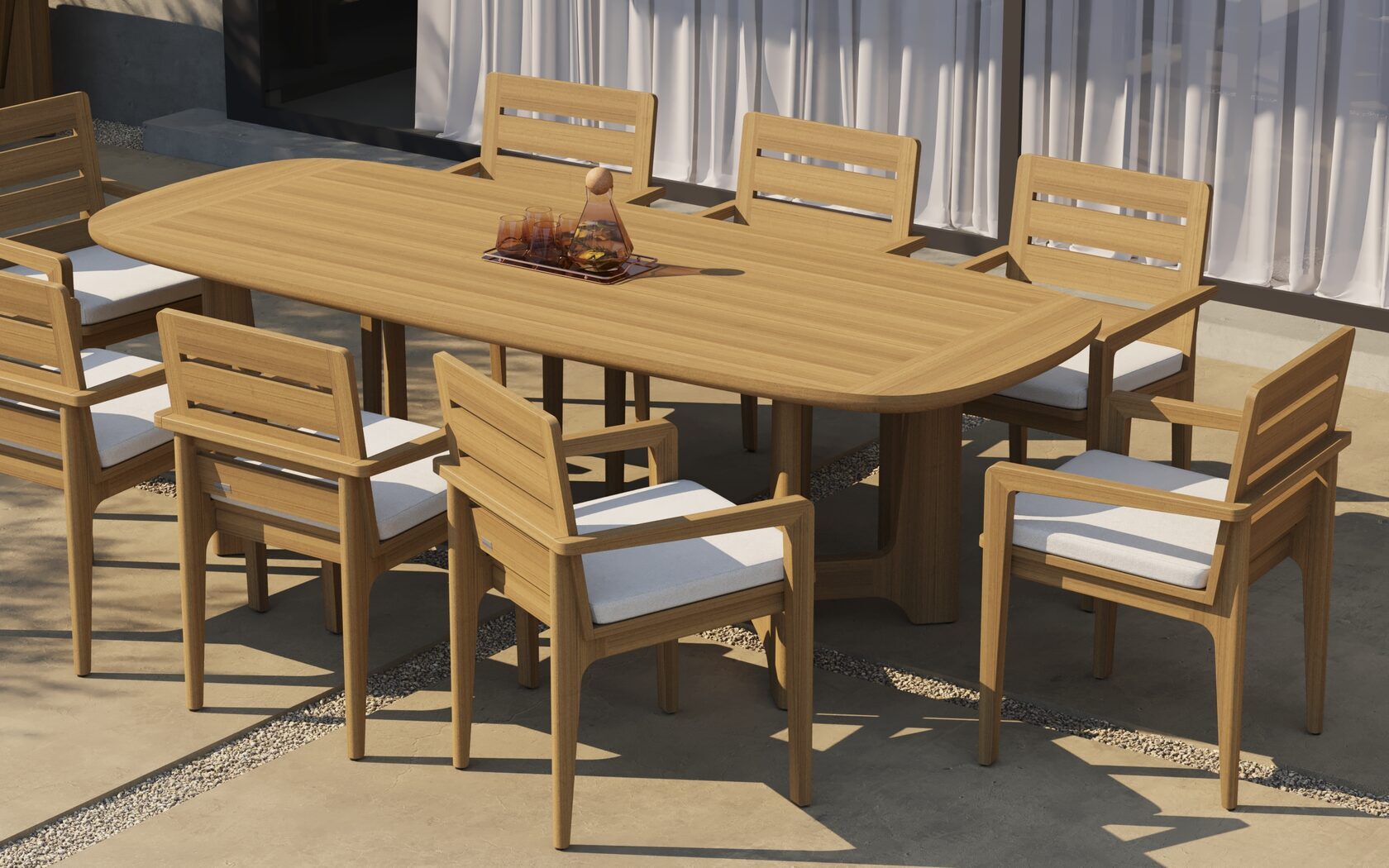 Для мягких элементов коллекции Merritt используются специализированные уличные ткани, устойчивые к ультрафиолету, влаге и загрязнениям. Ткани сохраняют насыщенность цвета даже под палящим солнцем и легко очищаются, что делает их идеальным выбором для лаунж-зон, террас и садов.