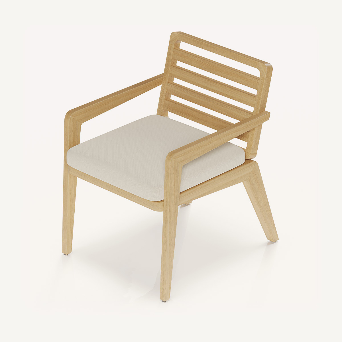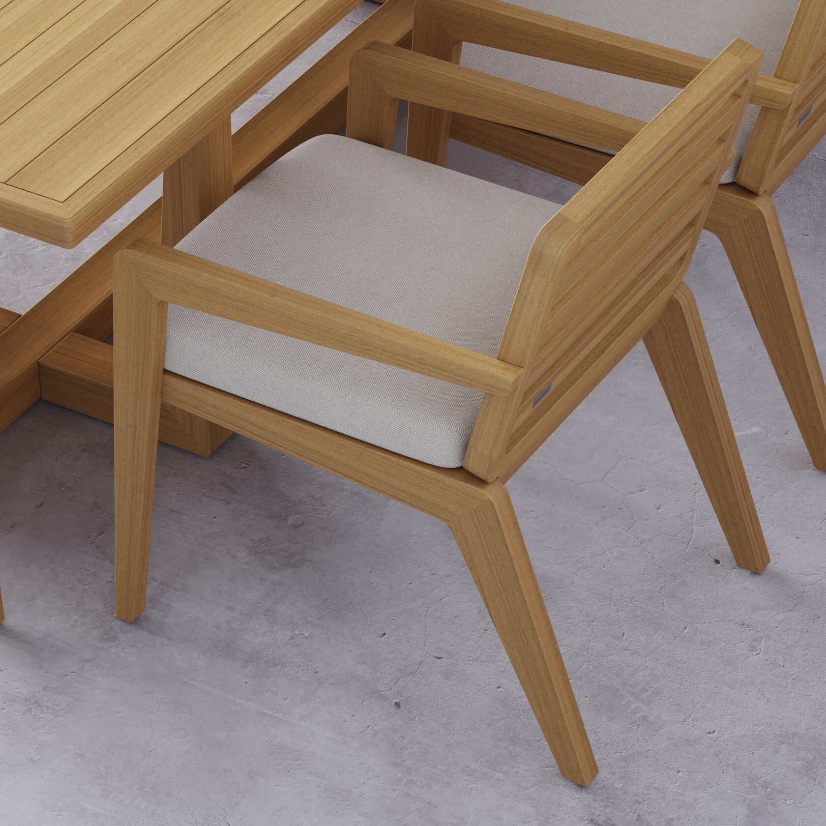 Обивочные материалы — это современные outdoor-ткани, разработанные специально для использования на открытом воздухе. Они обладают высокой светостойкостью (UV-resistance), защитой от влаги и загрязнений, а также сохраняют плотность и форму даже при активной эксплуатации. Съёмные чехлы доступны в палитре приглушённых природных оттенков, подчёркивающих натуральную эстетику дерева. Ткань имеет текстурированную поверхность, тактильно схожую с интерьерным текстилем, что делает посадку комфортной, а визуальный образ — уютным и живым.