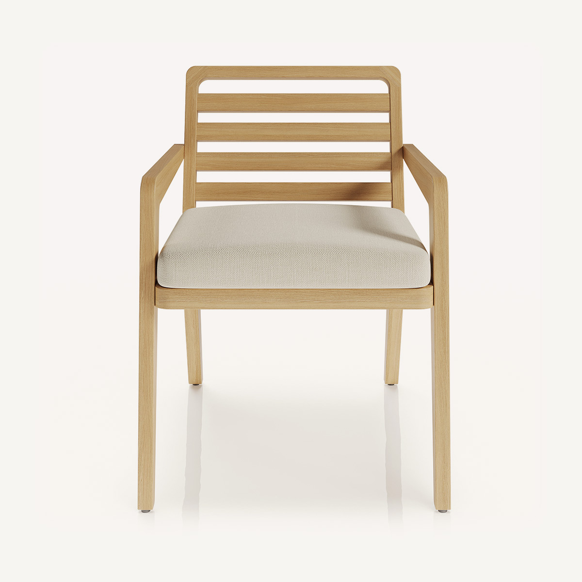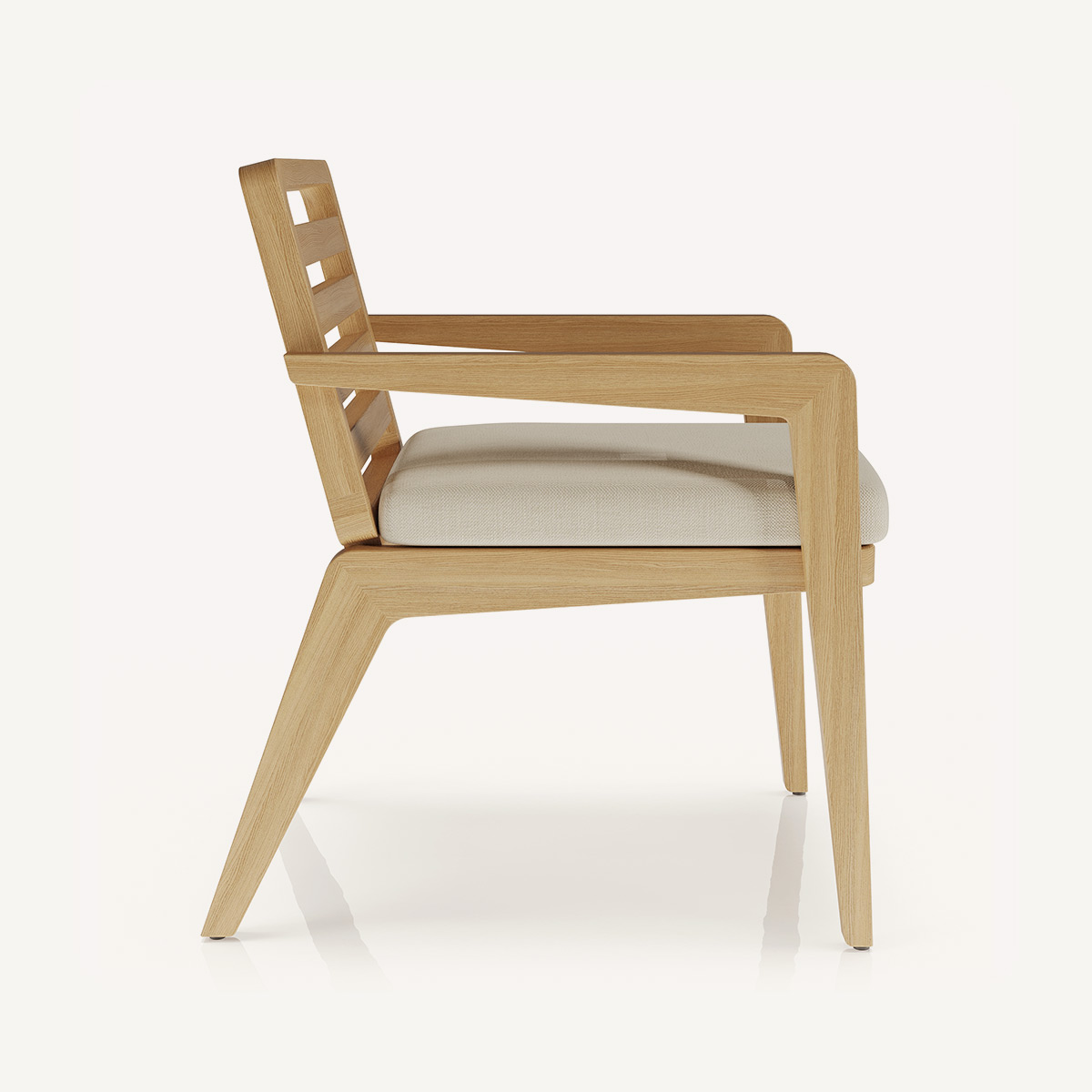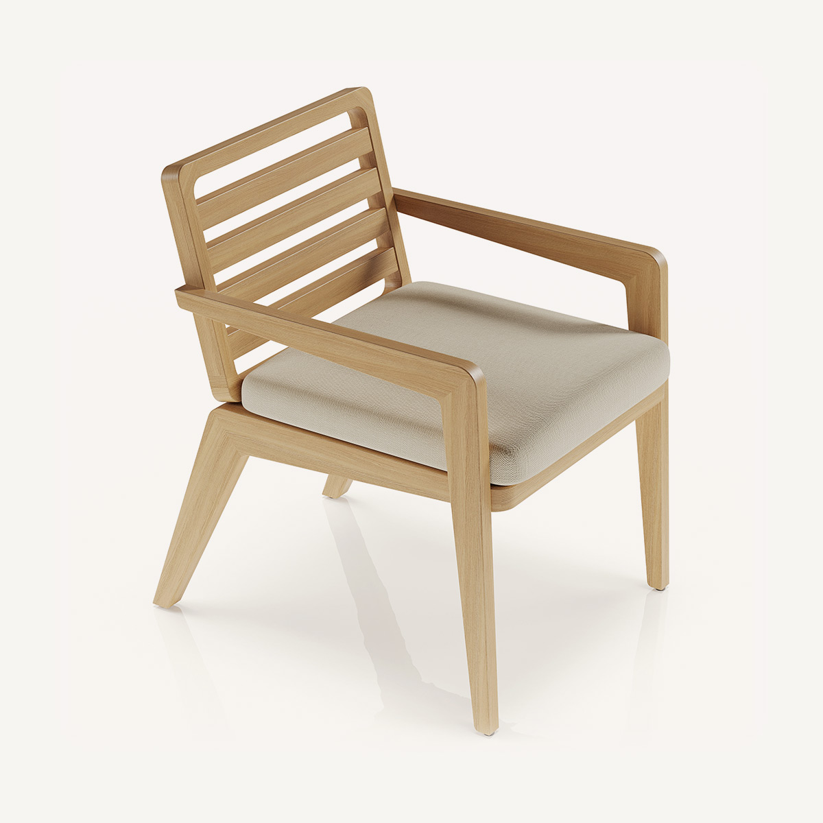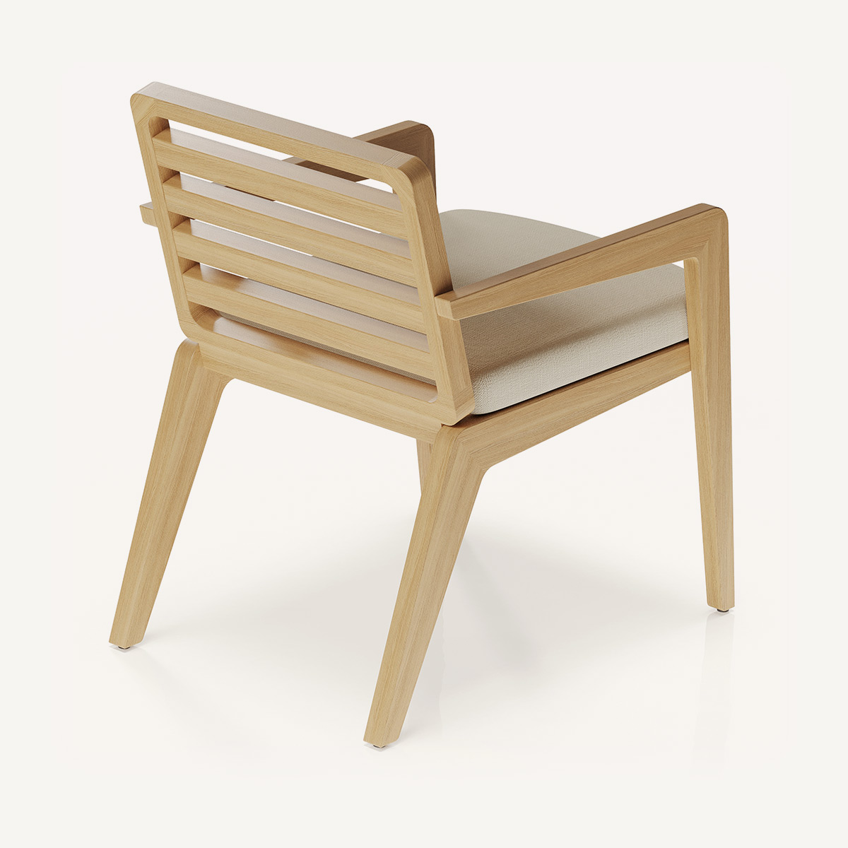 Обеденный стул ROCKLIN выделяется чёткой геометрией и выразительной решётчатой спинкой без подушки — акцент смещён на фактуру и рисунок натурального дерева ироко. Узкие подлокотники и остро очерченные линии боковин образуют цельную архитектурную форму, характерную для всей коллекции.