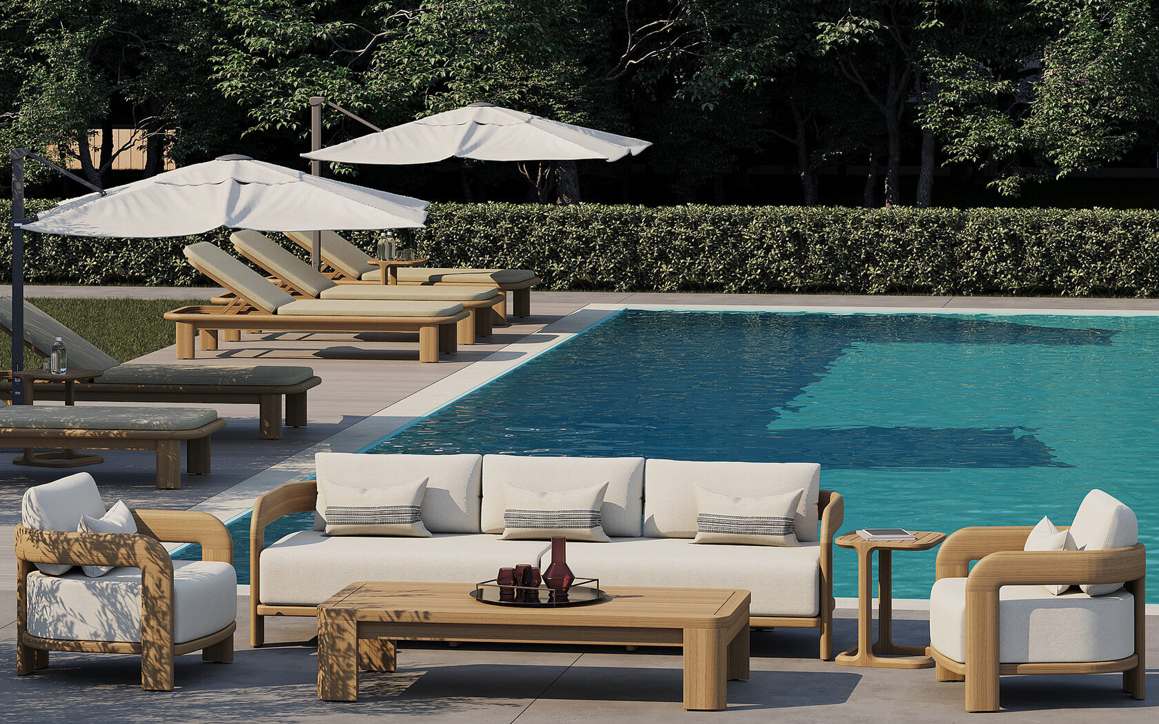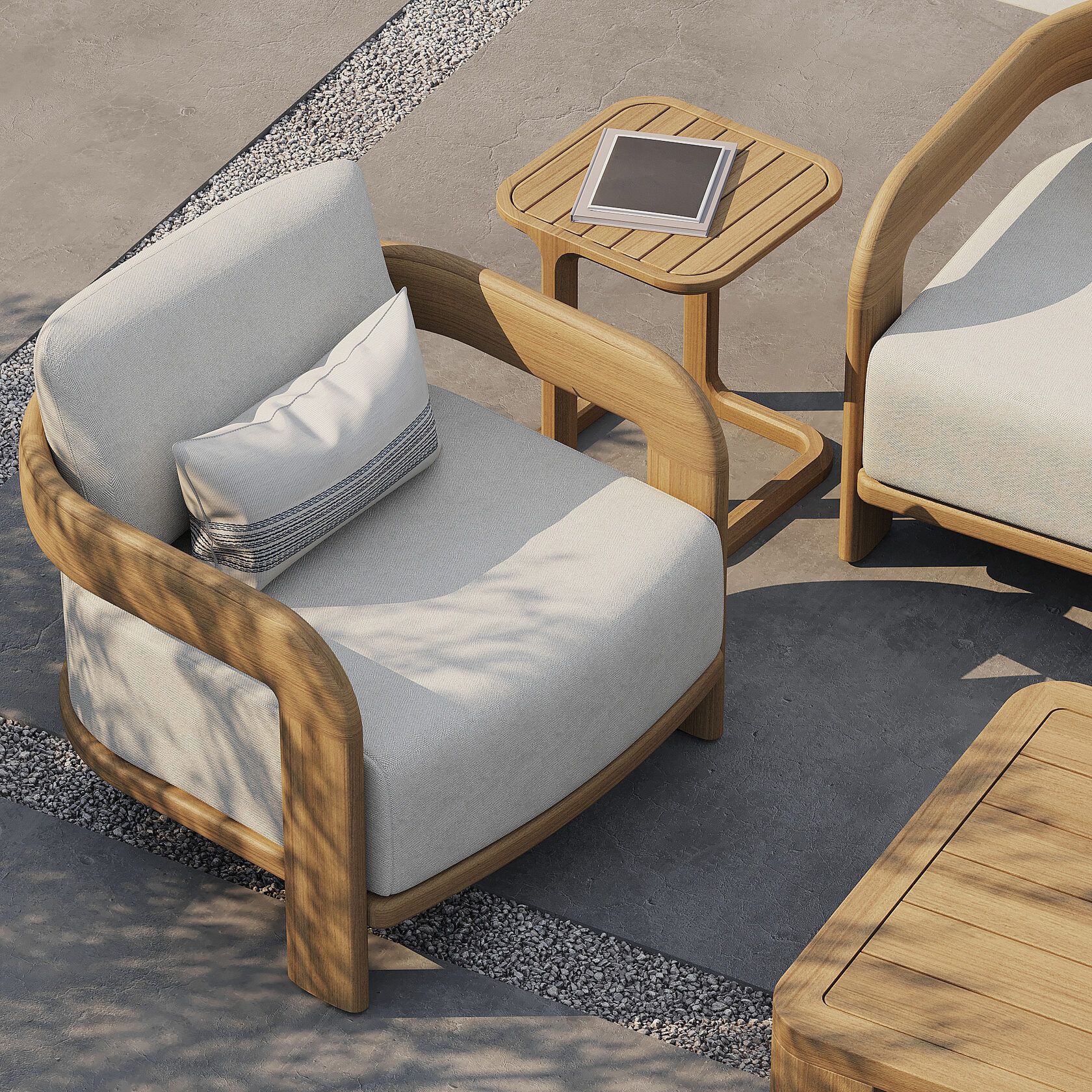 Для обивки коллекции Ellisse используется инновационная уличная ткань на основе переработанных волокон, сочетающих экологичность, прочность и выразительную текстуру. Материалы прошли лабораторные тесты на устойчивость к воздействию солнечного света, влаги и загрязнений. Эти ткани не только изысканно выглядят, но и легко чистятся, что делает уход за мебелью максимально простым и удобным. Подушки мягкие, но упругие — с наполнением, которое обеспечивает комфорт на уровне интерьера, даже на открытом воздухе. Тонкая цветовая палитра и приглушённые оттенки подчёркивают лёгкость силуэта и усиливают гармонию с природным окружением — будь то сад, лаунж зона отеля или патио.
