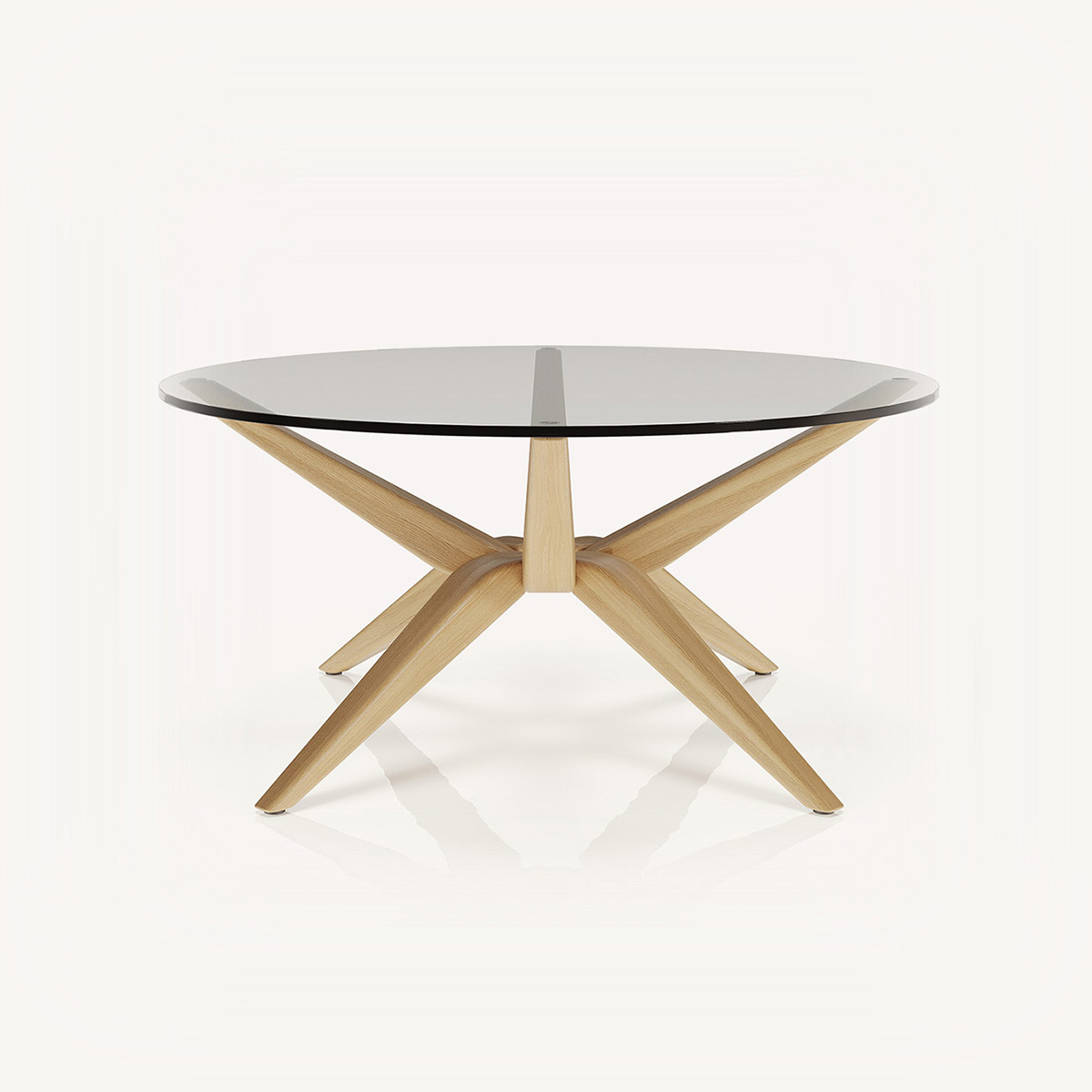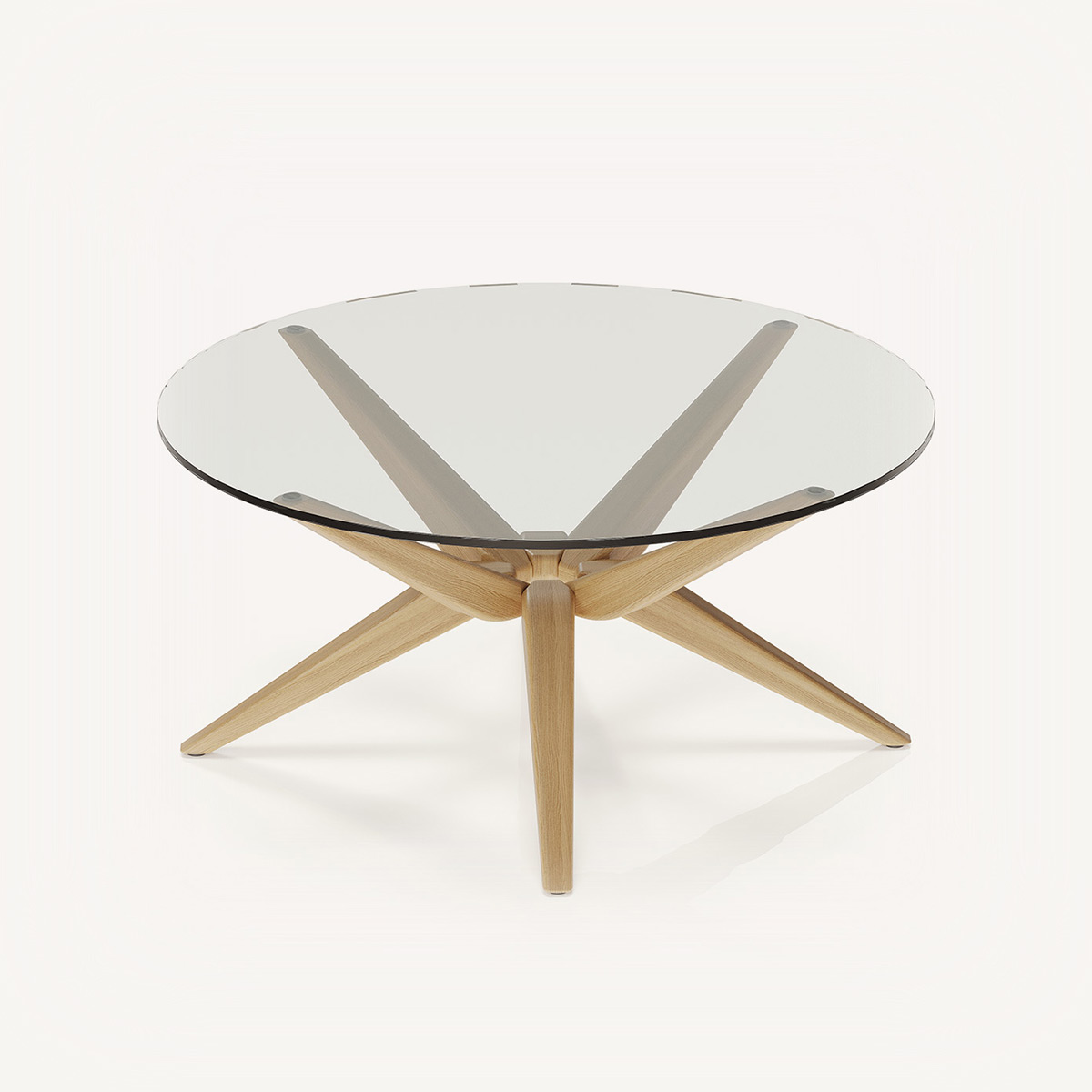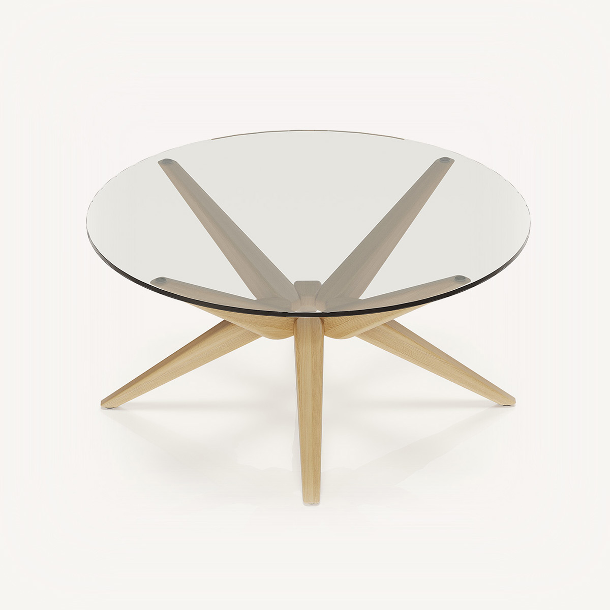 Центральный элемент лаунж-группы, круглый журнальный столик ROCKLIN объединяет лёгкость стекла и выразительность дерева. Звездообразная опора придаёт столу динамичность и скульптурный характер.