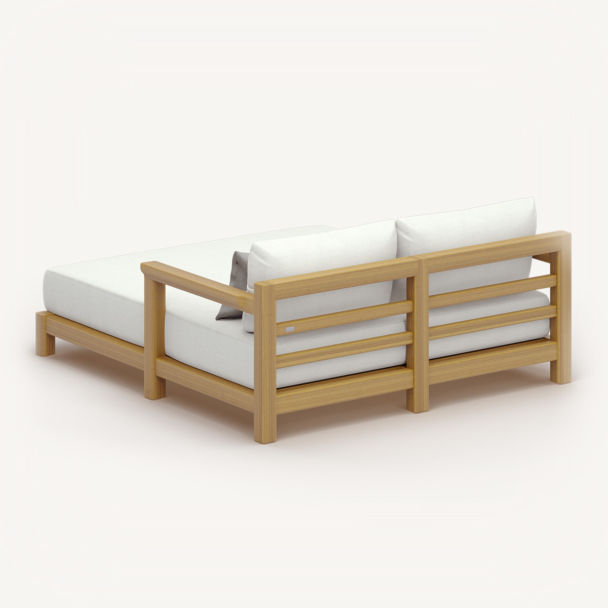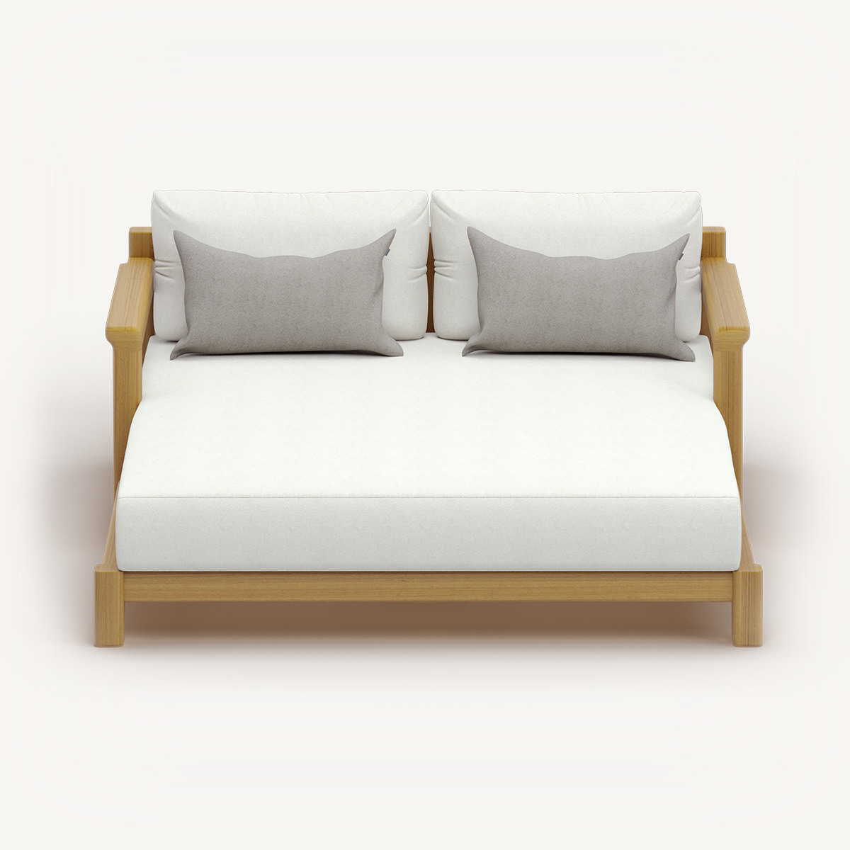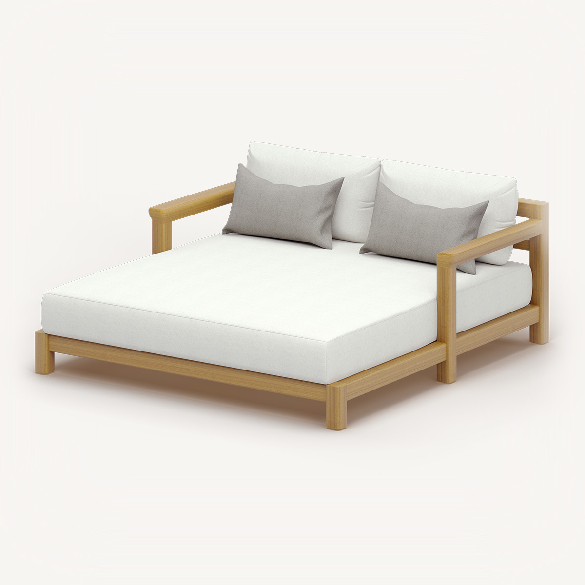 Уличная кровать — эффектный и редкий элемент, который задаёт новый ритм жизни на открытом воздухе. Просторная, низкая, обрамлённая деревянными подлокотниками, она превращает террасу, сад или лаунж-зону в продолжение спальни — только под небом.