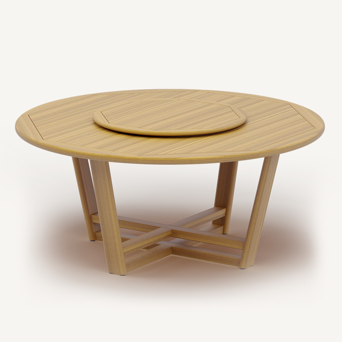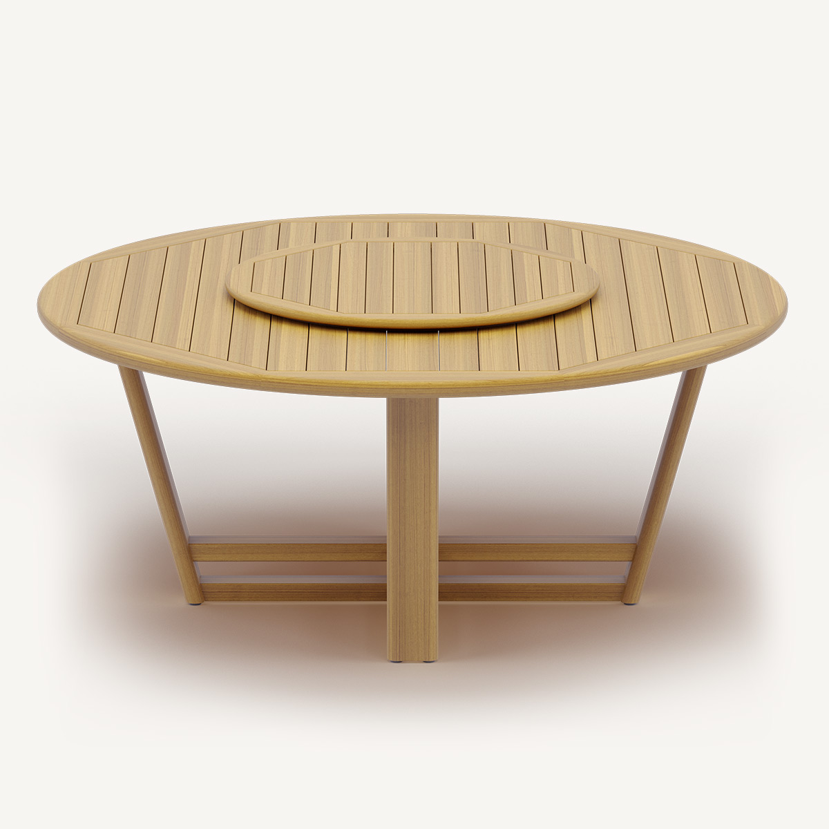Большой круглый стол для 8–10 персон, выполненный из ироко, с выразительной центральной частью, которая вращается для удобной сервировки. Конструкция визуально объемна, но сбалансирована за счёт плавной геометрии и тщательной проработки деталей. Стол задаёт ритм всей обеденной зоне и становится её ядром — как визуально, так и функционально.